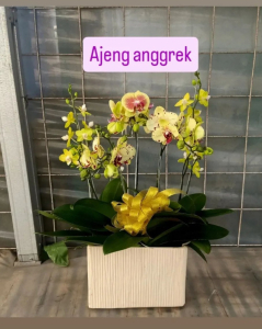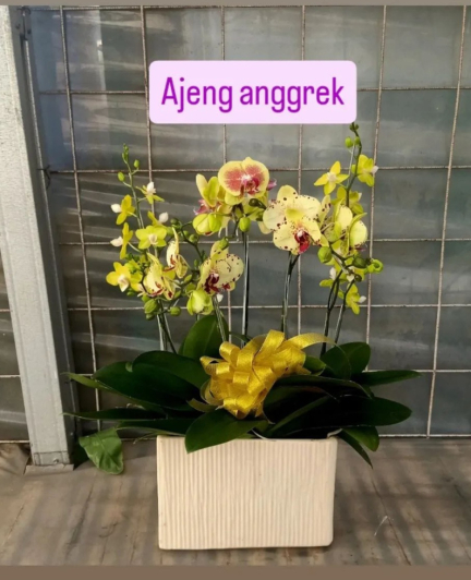 anggrek warna kuning dalan vas keramik